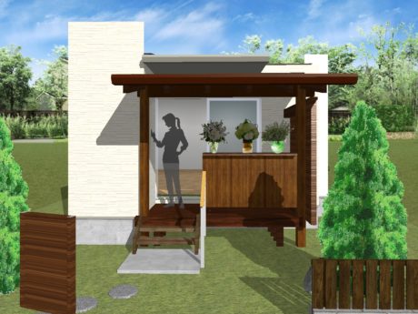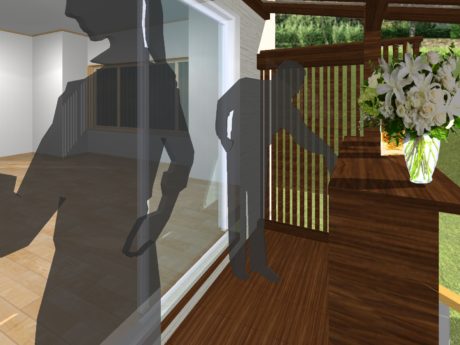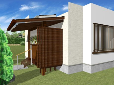 | ご提案内容 | ウッドデッキや屋根、下駄箱などの幅や大きさなどのご提案の説明が難しいので、3Dによるイメージ画像を使って、出来上がりのイメージを見ていただき、お打ち合わせを何度かさせていただきました。完成の写真と比べてもわかるように、3Dイメージしたものと同じものを作ることができました。 |